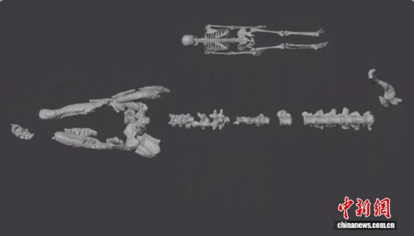 格兰德恐鳄(TMM43632-1)骨骼复原图。上方1.6米高人体骨骼(©Artec 3D)以供比例参考。中国科学院古脊椎所 供图