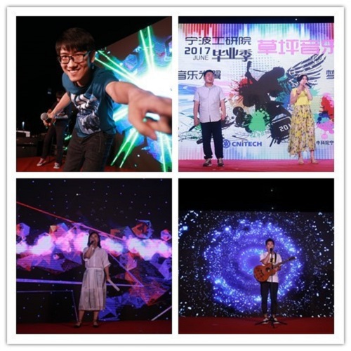 音乐会以2017届毕业生毕业视频暖场,一张张熟悉的面容,一句句沉甸甸的祝福寄托着毕业生的依依不舍和研究所对毕业学子未来前途的无限希冀。随着欢快的节奏和劲爆的热舞,音乐会正式拉开帷幕。吉他是音乐会永恒的标志,黄柯瑜、顾在旺、张海静用手中的吉他展示了“科研男”青春阳光的无限魅力;纺织学院刘杰演绎的原创歌曲唱出了对人生的感悟和对过往美好时光的怀念;“钢琴女神”杜启萍及搭档卜伟以一曲《贝加尔湖畔》让现场数百位观众感受到了纯净如泉水的美妙音符和婉转如鸟鸣的悠扬歌声;人力资源部郑晓宇带来一首耳熟能详的《同桌的你》,勾起了多少人关于校园时光的青春记忆;“钢琴男神”黄振伟则搭档歌声甜美的李萍,一曲《如果能在一起》倾诉出了曾经擦肩而过的恋人们的心声。来自宁波大学音乐学院的李林和毕业生家属孙梅联手为观众奉献了两首古筝名曲,古曲时而高亢时而低沉,随后,经典的琵琶独奏和二胡独奏更是让全场一度沉浸在中国古典音乐的高山流水之中。研究员张文武带来一曲笛子独奏,清脆的笛声表达了他对音乐会的祝福以及对毕业生的期望。青歌赛赛场上的“霓虹帅哥”杨燕鹤凭借雄厚的唱功和欢快的曲风带动了全场观众的情绪;,青歌赛冠军全成以其细腻的嗓音诠释了《你的背包》,赢得全场阵阵喝彩;研究员戴明志用一首时下热门歌曲《凉凉》讲述了一场缘定三生三世的爱情故事。随后,全成、戴明志联手奉献的经典歌曲《因为爱情》让场下无数观众为之沉醉。在青歌赛初出茅庐便引起轰动的唯一男团——怀柔F4用一曲饱含情怀的《一生有你》让毕业生们铭记最后的校园时光。