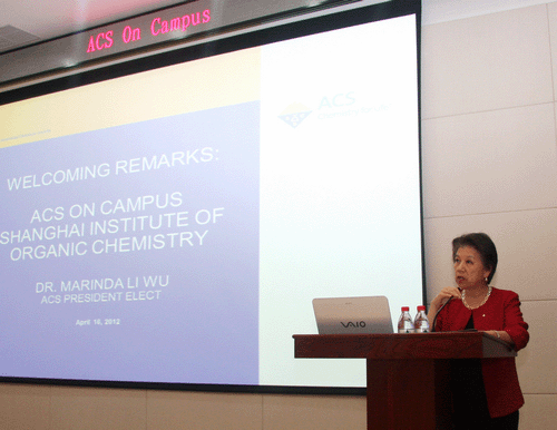 Marinda Li Wu博士在开幕式上致辞,她表达了对所长丁奎岭和上海有机所组织本次活动的感谢,在亲切地和听众分享了她的成长历程之后,她表示“ACS on Campus”旨在通过国际核心学术期刊主编及主要工作人员与听众的互动,为国内广大科研人员如何更好地开展研究和学习提供良好的意见和建议。她还鼓励听讲的学生和科研人员积极提问,从而增进投稿人和期刊之间的彼此理解和沟通。同时她还为上海有机所陆熙炎院士和林韶晖博士颁发了2011年度ACS期刊最高点击量论文的奖项(The No.1 Most Read Paper in 2011, ACS Publications)。