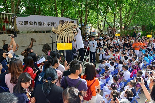 在第二现场活动中,昆明动物博物馆孙羽作为主持人介绍了亚洲象骨骼标本制作的背景,中科院技术能手罗文寿和标本制作师何桂武现场演示亚洲象骨骼拼接,遗传与资源进化国家重点实验室博士黄程用形象的肢体语言揭秘亚洲象的各块骨骼构造,并以科普化的语言介绍了亚洲象的基本知识,期间还进行了四轮有奖知识问答,小朋友们热情高涨,积极踊跃,将活动推向了高潮。伴随着知识解说和游戏互动,200多块凌散的骨骼,以合适的顺序和结构拼接成一具完整的亚洲象骨骼标本,仿佛恢复了其生活状态,被赋予了第二次生命。野生亚洲象已经很稀少了,而亚洲象标本的制作不仅能完好的保留这一物种的形态,更能让人们近距离的观察和认识它们。骨骼标本的制作,在研究、教学及展示上都充分体现了重要性和必要性,每一具动物标本都值得被重视,而赋予这些标本第二次生命的人们也更值得敬佩和尊重。爱动物是幼儿的天性,大自然的神奇吸引着幼儿,儿童眼中的动物那么美好、可爱,昆明市第二幼儿园的小朋友们在老师的指导下大胆想象创意,用色彩鲜艳的彩泥捏出各式各样、形态各异的野生动物作品,并与绘画结合,两种形式融合后生动地表达了他们对珍稀动物的理解。