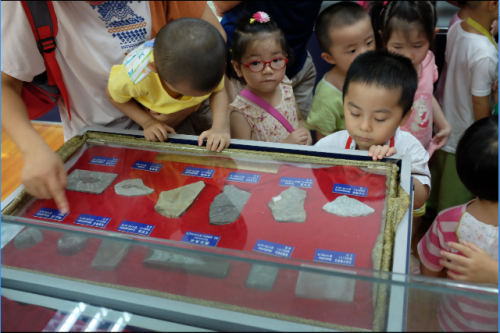 走进馆内,丰富的矿物岩石、古生物标本和模型让孩子们惊叹不已。他们与生俱来的冲动、好奇、好问、好探究的本能得到了充分发挥,一张张可爱的小脸上写满了欣喜。孩子们观看了《火山》科教片,随后他们寻找着摆放恐龙蛋和三叶虫等古生物化石的标本展柜。老科学家志愿者用丰富的肢体语言,向小朋友们讲述着过去的故事,在侏罗-白垩纪时代,地球的陆地上到处都能见到恐龙,由于北方天气比较寒冷干燥,微生物作用比较弱,所以那里的恐龙蛋保存的比南方的好。讲解过程中,孩子们还了解到三叶虫是比侏罗纪更早的寒武-奥陶纪的动物,它们生长在海洋里,有的很大,有的很小。小朋友们在“石头”的世界里漫游,沿着各种“石头”和动物的进化历史,迈动着他们幼稚的小脚步,不时提出各种充满童趣的问题。