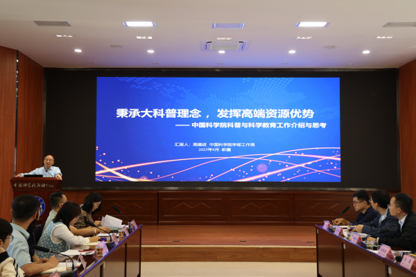 会上,新疆分院相关负责人介绍了新疆分院在科学普及与科学教育领域的整体布局与实施进展,重点汇报了新疆分院在整合科普资源、打造品牌活动、培育专业科普队伍等方面的具体举措与阶段性成果。中国科学院学部工作局三级职员周德进以《秉承大科普理念,发挥高端资源优势——中国科学院科普与科学教育工作介绍与思考》为题作了报告。