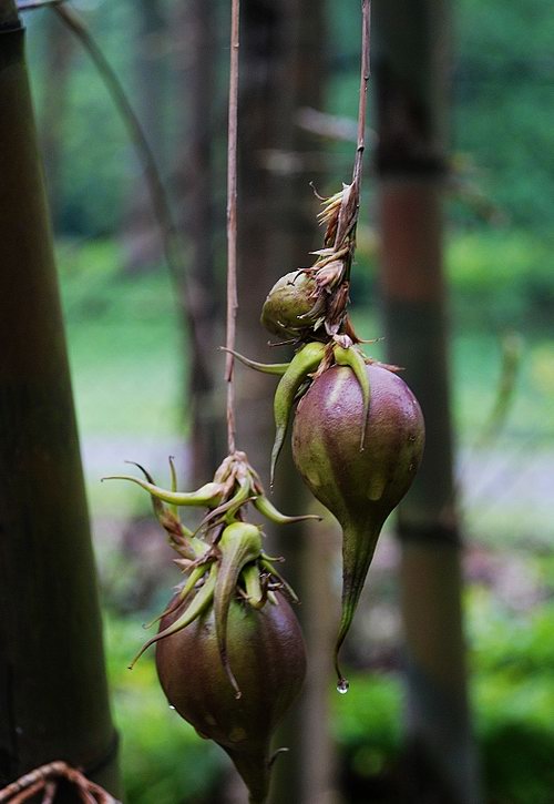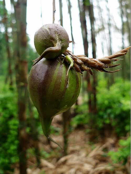 近日,华南植物园的竹园内有几大丛梨竹(Melocanna baccifera (Roxb.)Kurz f.)就开花结果了。它不像其他竹子长出的是像麦穗一样的颖果,而是结出形似鸭梨般大小的浆果,故称梨竹。而全世界能结浆果的竹子只有两种——梨竹和小梨竹(Melocanna humilis Kurz)。由于梨竹果实的尾部有象鼻一样的弯钩,也称为“象鼻竹”。梨竹不仅果实奇特,生殖方式也与众不同,其种子能在母株上生根萌芽,然后从母株上脱落,继而长成小竹苗,在学术上称为“胎生”现象。而母株在开花结果后就会死亡。
