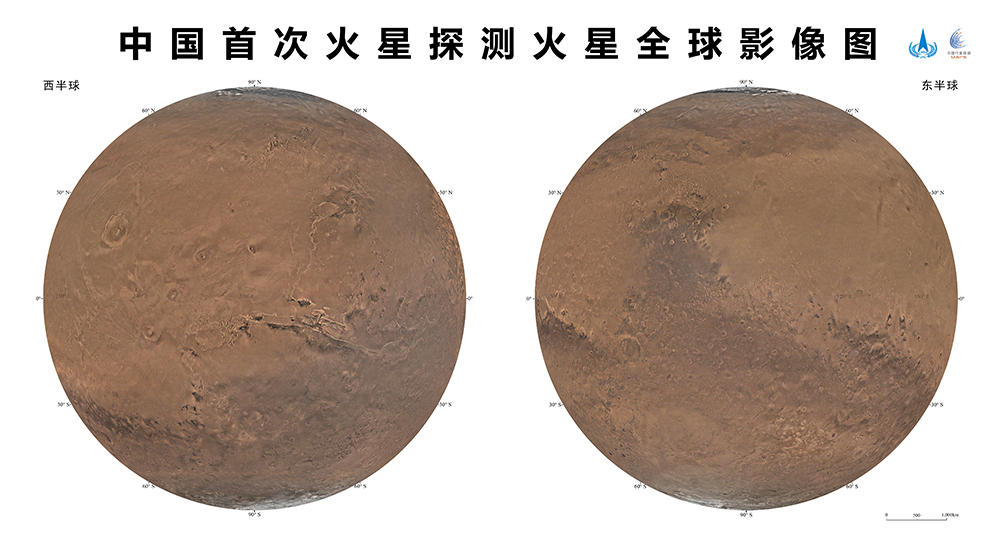 在2023年“中国航天日”主场活动启动仪式上,国家航天局和中国科学院联合发布了中国首次火星探测火星全球影像图。本次发布的影像图为彩色,包括按照制图标准分别制作的火星东西半球正射投影图、鲁宾逊投影图和墨卡托投影加方位投影图,空间分辨率为76米,将为开展火星探测工程和火星科学研究提供质量更好的基础底图。天问一号任务获取的包括影像图在内的一批科学探测数据,将为人类深入认知火星作出中国贡献。