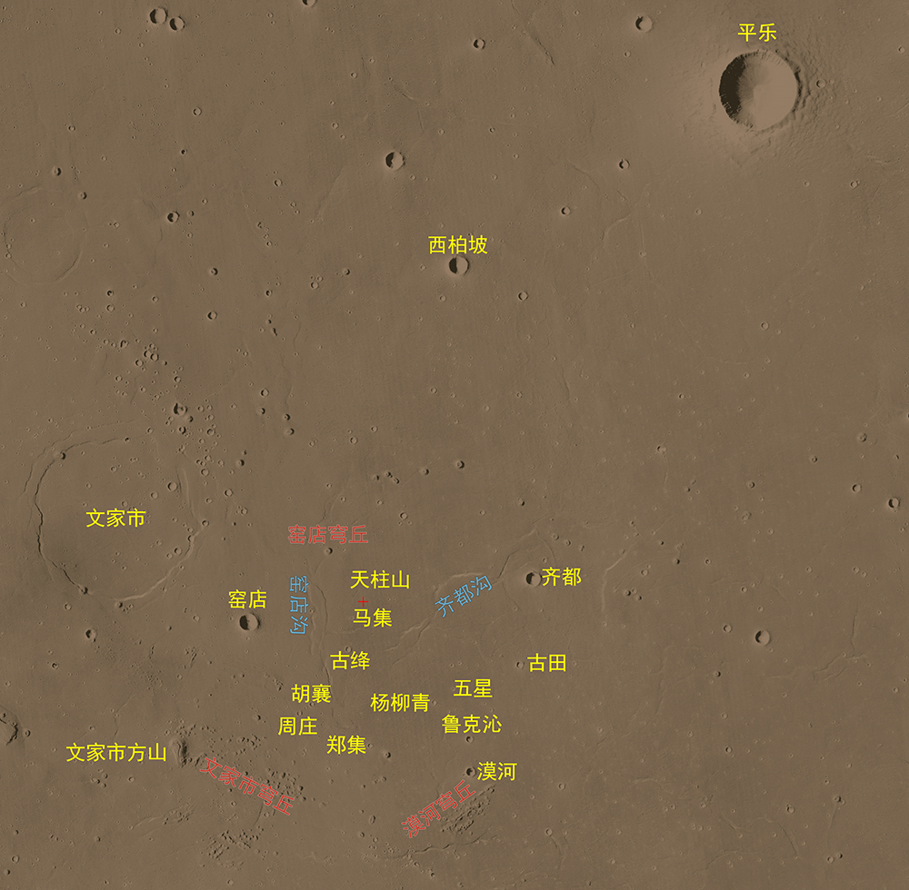 科学研究团队通过火星高分影像,识别了着陆点附近大量的地理实体,国际天文联合会根据相关规则,将其中的22个地理实体,以中国人口数小于10万的历史文化名村名镇加以命名,将中国标识永久刻印在火星大地。