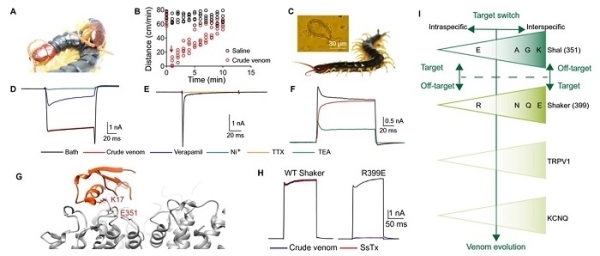 该研究观察到蜈蚣种群内存在激烈竞争,同时伴随同类之间的毒液注入。与种间竞争不同,蜈蚣种群内个体之间的毒液注射能迅速导致非致死性的运动系统短暂麻痹,与种内竞争生存资源的生物学意义相吻合。研究发现,蜈蚣的毒液仅专一抑制蜈蚣神经元上的钾离子流,而对其他类型的离子流并无作用,提示在其种内竞争中发挥功能的可能是一种钾离子通道。进一步的分子克隆与功能实验表明,这种钾离子通道是蜈蚣介导A型瞬时钾电流的Shal通道。研究还证实,蜈蚣毒素SsTx是介导Shal抑制的关键毒液成分。因此,SsTx-Shal的相互作用是介导蜈蚣种内竞争的物质基础和重要机制,其生物学效应是非致死性运动系统短暂麻痹。