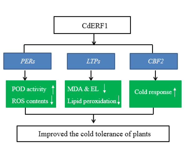 进展二:以上述筛选获得的耐寒和低温敏感狗牙根种质为材料,低温处理后进行RNA-Seq分析,鉴定到一个受低温显著诱导的基因CdERF1,且其在抗寒种质中表达水平更高。CdERF1基因编码的蛋白定位于细胞核内,具有转录激活活性。异源表达CdERF1能增强转基因拟南芥的耐寒性,具体表现在叶片电解质渗透率(EL)、丙二醛(MDA)、ROS含量的降低,SOD、POD酶活性的升高。而利用病毒诱导基因沉默(VIGS)方法抑制狗牙根内源CdERF1的表达,导致狗牙根对低温胁迫更加敏感。以过表达转基因拟南芥和VIGS狗牙根为材料进行RNA-Seq分析,发现狗牙根CdERF1可能通过转录调控抗氧化基因(POD)、脂转移蛋白家族基因(LTP)以及CBF2基因的表达来响应低温胁迫。研究对于了解狗牙根抗寒机理具有理论意义,为通过基因工程技术快速、精准培育耐低温狗牙根种质提供新的基因资源。相关研究成果以The Ethylene Responsive Factor CdERF1 from Bermudagrass (Cynodon dactylon) Positively Regulates Cold Tolerance为题,发表在Plant Science上。