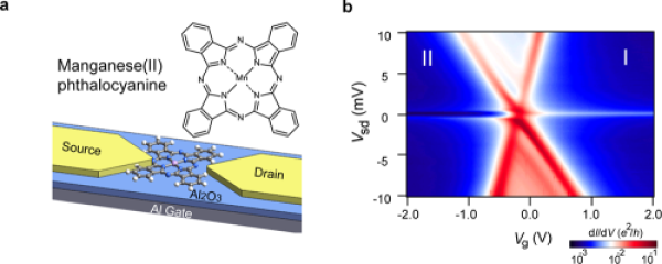 图1 a.酞菁锰分子结构及器件示意图;b.单个酞菁锰分子晶体管器件低温下输运特性