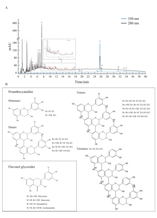 植物所王亮生研究组以保育的古莲资源为研究对象,运用FRAP、ABTS和ORAC等评估方法对不同古莲品种的不同部位进行了体外抗氧化活性评价。研究表明,古莲的莲房具有显著高于其他部位的抗氧化能力,这与其含有的酚类物质种类和含量显著相关。研究通过UPLC-TQ-MS分析,检测到古莲莲房中含有丰富的原花青素和黄酮醇。经过鉴定的51种酚类化合物中,有27种是首次从莲房中检出,包括20种原花青素三聚体、5种原花青素二聚体和2种原花青素四聚体。相关性分析表明,莲房的抗氧化活性与其原花青素的含量密切相关,且原花青素三聚体的含量与其相关性最强。在所评价的古莲品种中,普兰店古莲的莲房抗氧化能力最强、酚类物质含量也最丰富,是理想的抗氧化剂来源。本研究为莲中多酚类开发利用提供了重要参考,进一步证实了莲房提取物的抗氧化活性和潜在功效,揭示了其在饲料和食品添加剂开发方面的利用潜力。