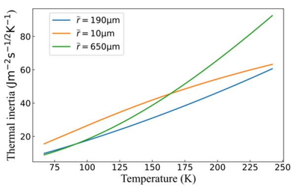 图2.Interamnia不同粒径尺寸的热惯量随温度的变化情况