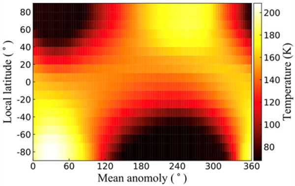 图3.Interamnia在一个公转周期内季节性表面温度变化