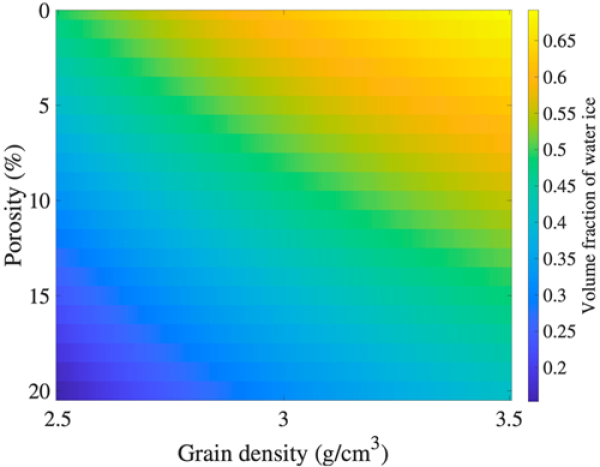 图4.不同颗粒密度和孔隙率的水冰体积分数估算