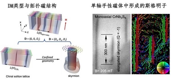 DM作用类型与对应的拓扑磁结构(左);电子全息技术揭示单轴手性磁体Cr1/3NbS2中发现的磁斯格明子(右)
