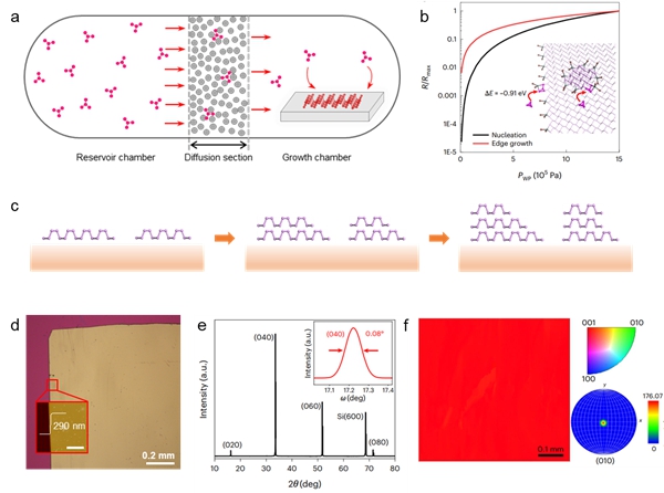 黑磷以高载流子迁移率、宽广可调的直接带隙、原子层范德华集成等独特性质,成为继硅等半导体材料之后,面向下一代电子、光电子应用的重要备选材料之一。与硅基芯片依赖于高质量单晶硅的制备类似,大面积高质量黑磷二维原子晶体薄膜的制备是其走向规模化集成应用的基础。由于黑磷晶相苛刻的形成条件,薄膜生长过程中成核与成核密度难以控制,故现有方法制备的黑磷薄膜普遍为多晶结构,其晶体质量难以满足高性能器件的应用需求。近年来,尽管已有一些阶段性进展,例如,张凯团队对黑磷薄膜生长展开了持续探索,通过相变诱导成核的设计实现了介质衬底上黑磷薄膜的成核与异质外延生长(Nature Communications 2020, 11, 1330),但因生长可控性制约,薄膜的晶畴尺寸限于百纳米级。高质量黑磷薄膜尤其是单晶薄膜的生长仍是亟待攻克的难题。