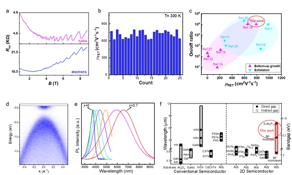 图2.黑磷单晶薄膜的电学性能及其合金薄膜的直接带隙覆盖范围