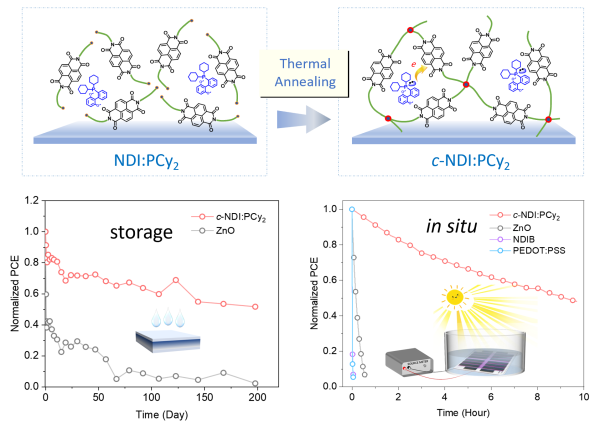中国科学院化学研究所侯剑辉团队通过交联和非极性掺杂剂掺杂相结合的策略,设计开发了一种兼具高电导率和较强疏水性的阴极界面层c-NDI:PCy2,以此实现有机光伏电池稳定性的突破。他们合成了一种可交联的萘二亚胺类有机小分子NDI-A,通过热退火处理生成交联c-NDI-A薄膜,该薄膜对常用的极性和非极性溶剂均表现出很强的耐侵蚀性,为有机光伏电池的逐层溶液加工提供可行性。此外,他们筛选出一种疏水性小分子二环己基(2',6'-二甲氧基-[1,1'-联苯]-2-基)-膦(PCy2)作为n型掺杂剂,用于提高交联薄膜的电导率,制备出兼具4.0 eV低功函数和6.5 × 10-3 S m-1高电导率的阴极界面层c-NDI:PCy2。基于c-NDI:PCy2的电池获得了17.7%的能量转换效率,同时表现出了极佳的抗水稳定性。将未封装的电池直接浸入水中,在避光存储1000小时后或在持续光照4小时后均能够保持其初始光伏效率的70%;相比之下,基于传统氧化锌界面层的电池在相同条件下会发生能量转换效率的急剧衰减,甚至完全失去光伏性能。相关成果近期发表在Joule上。