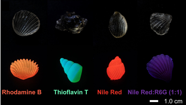 利用模型浇筑的生物分子玻璃照片(上);添加了荧光染料的生物分子玻璃照片(下)