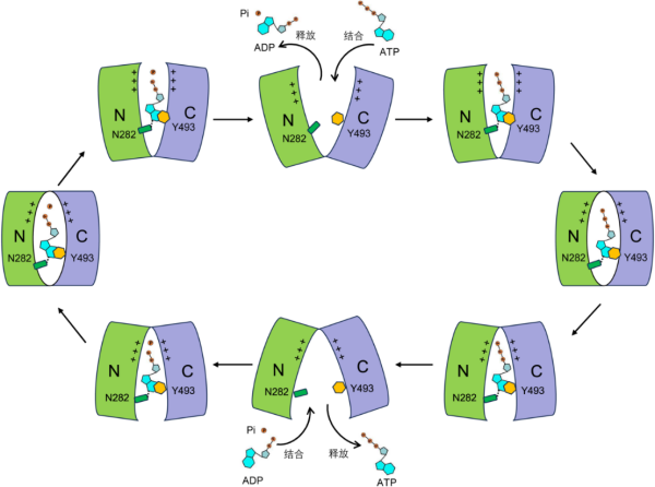 该团队解析了肺炎衣原体和植物叶绿体NTT蛋白的高分辨率三维结构,发现尽管二者来源不同但三维结构高度相似,印证了叶绿体NTT蛋白来源于衣原体的假说。研究发现,ATP(或ADP+Pi)结合位点位于NTT蛋白中央,由保守的氨基酸如天冬酰胺特异识别ATP。结构分析和功能实验表明,NTT蛋白由N端和C端两个相对刚性的结构域组成,二者之间通过相对摆动促进ATP结合、跨膜运输和释放。