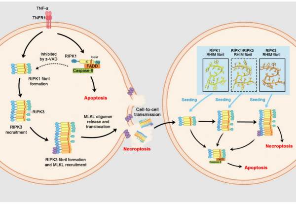 上述研究揭示了功能性坏死小体淀粉样纤维可在细胞之间传播坏死信号,提出了细胞死亡信号的跨细胞放大新机制。同时,研究表明,RIPK1/RIPK3坏死小体纤维作为“功能性”淀粉样纤维,具备类似朊蛋白的传播特性。