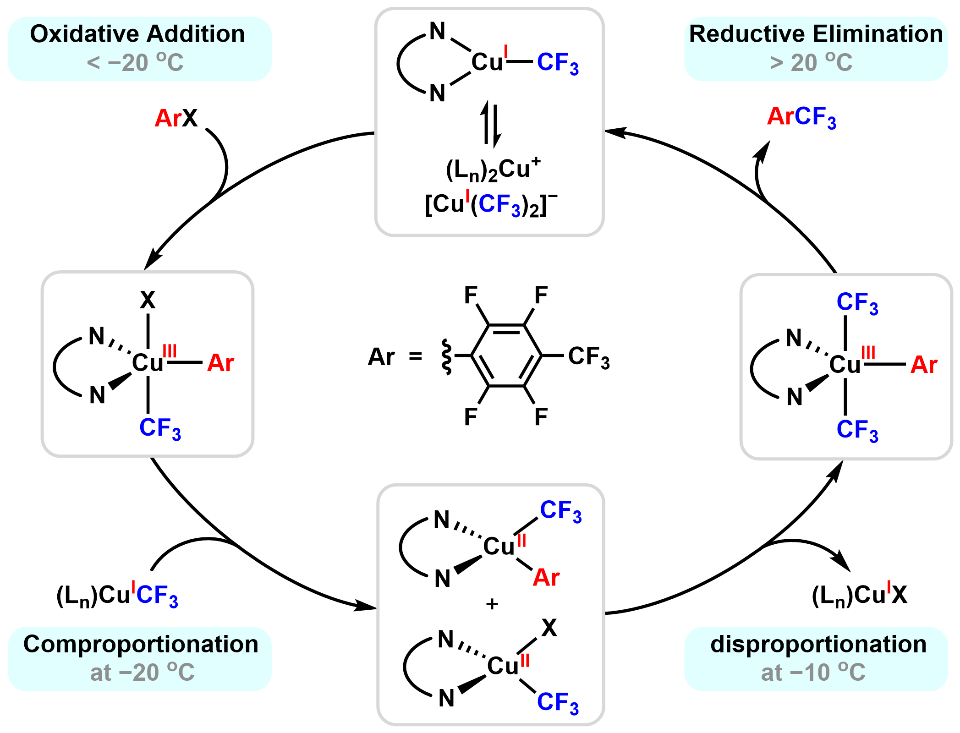 科研人员进一步对反应中每个过程开展详细的实验和理论研究发现,反应中铜(I)物种的氧化加成,可同时经历单金属和双金属的协同过程。其中,在低铜(I)浓度下,单金属协同过程为主要过程。铜(III)和铜(I)的归中反应几乎没有任何能垒,但随后的铜(II)之间的歧化过程能垒较高,为双分子过程且可能经历三氟甲基自由基转移机理。这统合了此前提出的多种机理假说,支持了反应中协同氧化加成机理以及铜(III)物种的存在,也支持了铜(II)中间体的产生,并剖析了无法观测到芳基自由基生成的原因。