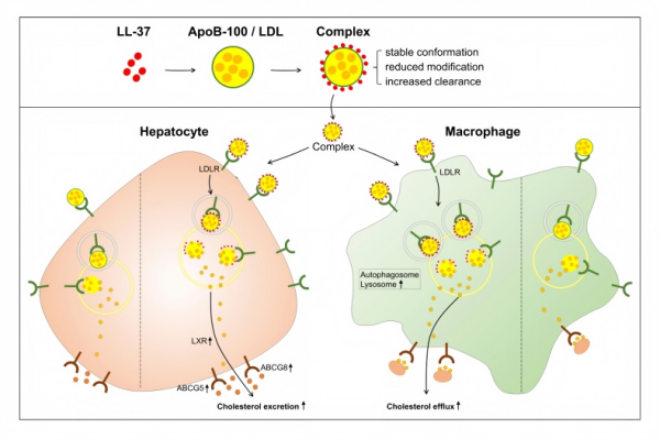 中国科学院昆明动物研究所研究员赖仞研究团队联合加拿大多伦多大学教授倪合宇团队,研究发现Cathelicidin抗菌肽LL-37直接结合LDL及其核心载脂蛋白B-100(ApoB-100),促进肝细胞对LDL的摄取和清除,从而缓解高脂高胆固醇饮食引起的肝脏脂肪积聚。