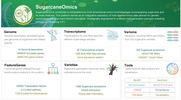 中国科学院北京基因组研究所(国家生物信息中心)发布甘蔗多组学数据整合资源平台SugarcaneOmics,旨在为全球甘蔗研究者提供一站式多组学数据查询、分析与可视化服务,支撑甘蔗功能基因组学研究及分子育种,助力开启甘蔗“组学驱动育种”新时代。