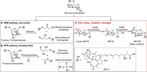 糖类是细胞能量的主要来源,也是构成细胞结构的重要组成部分。其中,以己糖为代表的分子通过碳-碳键断裂生成短链化合物,是其进入代谢网络并执行生理功能的重要途径。通常,在初级代谢中,己糖的裂解反应通过己酮糖的反向醛缩或类转酮机制实现。但是,在化学多样性极为丰富的次级代谢领域,己糖裂解反应却鲜有报道。