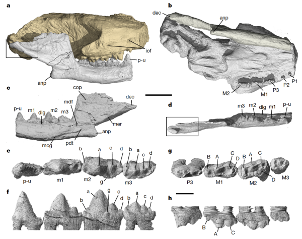 其臼齿形态与南非的巨带齿兽相似,齿骨髁结构简单,由齿骨外脊末端向上弯折形成,尚未膨大为球状。该发现为“哺乳动物齿骨髁起源于齿骨外脊后端”这一假说提供了实证,填补了从早期真犬齿兽类的齿骨-鳞骨接触到早期哺乳型类的球状齿骨髁之间的形态过渡环节。