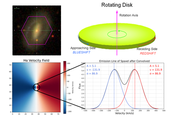 科研团队在简单星系旋转盘模型基础上,使用MaNGA空间分辨像素数据,给出核环导致星系中心出现对称的双峰窄发射线特征的可能性。棒旋星系中的核环恰好满足这一条件:棒驱动的内流气体在内林德布拉德共振处聚集成核环,产生明亮窄发射线的强辐射区,同时其位于旋转曲线陡峭变化的区域。核环在空间上的尺度小,但其旋转速度差异大。因此,在望远镜点扩散函数影响下,中心空间像素混合了核环的接近侧(高速蓝移气体)和远离侧(高速红移气体)的贡献,形成对称的“双峰轮廓”。同时,团队发现核环的旋转是有序且对称的,导致最终产生的双峰窄发射线特征在空间上的变化整体上也是对称的。