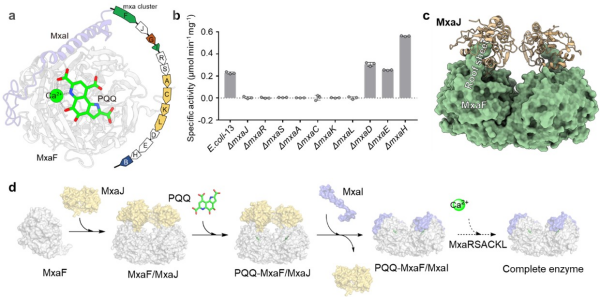 在此基础上,研究团队采用基因缺失与蛋白组分分析相结合策略,鉴定出9个参与MDH合成与组装的关键基因,并发现了一个介导辅因子PQQ与酶蛋白分子精确装配的分子伴侣(MxaJ)。利用冷冻电镜解析MxaJ与酶蛋白组成的蛋白复合体结构,团队发现MxaJ通过与酶蛋白PQQ结合“口袋”上方的环形区相互作用,使该“口袋”得以暴露,促进PQQ的结合。
