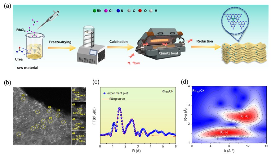 近期,研究团队创制了具有单团簇结构的RhSC/CN催化剂,克服了纳米颗粒催化剂活性金属原子利用率较低,以及单原子催化剂反应效率不高等问题,提升了二氧化碳加氢制乙醇的选择性和乙醇产率。研究发现,这一催化剂的活性金属以单团簇形式存在,具有近原子级分散度和对反应物分子较强的吸附活化能力。反应条件经过优化后,催化剂展现出最高的乙醇选择性和乙醇产率,分别为95.3%和17.5 mmol/gcat/h,其上转换频率TOF值达595.2 h⁻1。原位红外表征证实,该催化剂特有的单团簇结构,可促进碳碳偶联反应和关键中间体生成。理论计算显示,催化剂单团簇活性位上CH3*和CO*反应中间体进行碳碳偶联,具有最低的反应能垒,并揭示了乙醇生成的最优反应路径。