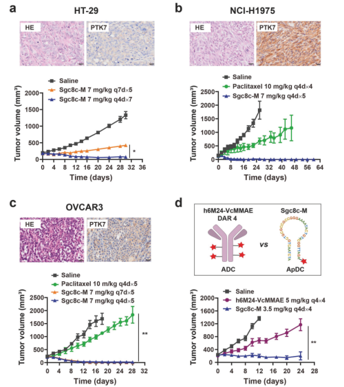 在多种PTK7过表达的癌症模型(如三阴性乳腺癌、胰腺癌、结直肠癌、非小细胞肺癌和卵巢癌模型)中,Sgc8c-M均显示出优异的肿瘤抑制效果,可诱导细胞系来源异种移植瘤和人源肿瘤异种移植瘤的持续消退,其疗效优于游离MMAE、化疗药物紫杉醇以及负载相同MMAE药物的PTK7 ADC。
