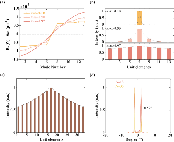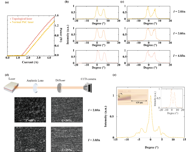 研究团队从经典一维拓扑Su-Schrieffer-Heeger(SSH)模型出发,利用结构的手征对称性保护特性,调控SSH晶格中的单元耦合强度,实现拓扑边界态在实空间中的离域化分布;借助基于图形化电极结构的非厄米调制,离域化的拓扑边界态能够在无序背景中保持主导地位,呈现出独特的自组织模式。与同等规模的光子晶体激光器相比,该拓扑激光器具有更高的空间相干性,这使其展现出更低的阈值、更稳定的输出空间模式以及更高的散斑对比度,同时,进一步扩大了拓扑边界态的空间分布规模,并引入移相耦合器以提升输出光功率密度。