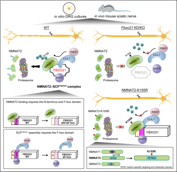 上述研究揭示了FBXO21是调控NMNAT2稳定性的关键因子,为轴突退化机制提供了新见解。同时,研究鉴定出SCF复合物中决定NMNAT2底物特异性的F-box蛋白FBXO21,为靶向NMNAT2治疗神经损伤和神经退化疾病提供了可能的靶点和干预策略。