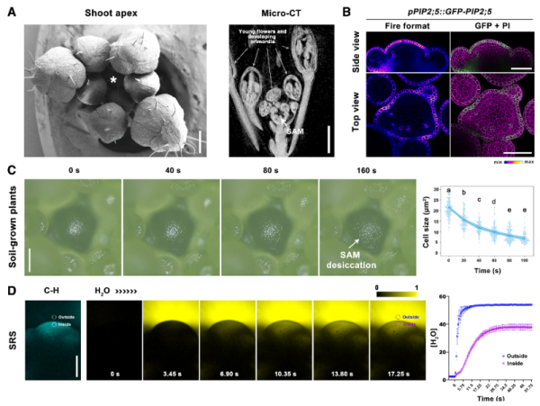 研究发现,植物茎尖分生组织处于局部高湿微环境中,能够主动感知湿度变化以维持分裂能力。当水分平衡被破坏时,干细胞活性受到抑制,导致器官发育受阻,影响整体植株生长。为解析水分动态过程,该团队与复旦大学季敏标课题组合作,将受激拉曼显微技术应用于植物研究,实现了在细胞水平对植物组织中水分交换过程的无损实时动态监测。