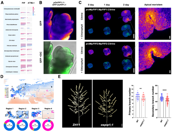 表皮介导的分生组织水分感知与响应机制在植物演化中高度保守。研究在早期陆生植物地钱和单子叶作物水稻中均发现类似的表皮特异性水分通路。水稻同源基因OsPIP1;1功能与拟南芥PIP2;5相似,其单倍型分布也与空气湿度相关。高表达单倍型OsPIP1;1-SNPT多见于湿润地区,低表达单倍型OsPIP1;1-SNPC偏好干旱环境,表明OsPIP1;1介导的水稻穗原基水分感知,同样受到气候驱动的自然选择。