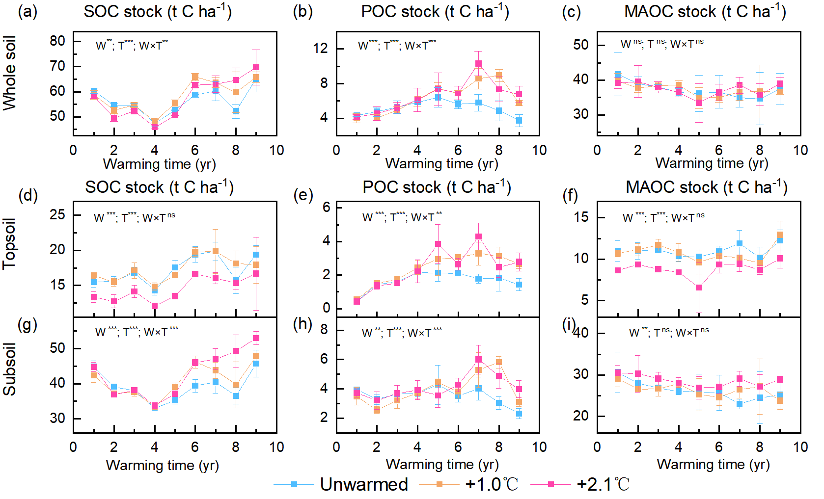 研究发现,土壤不同有机碳组分对增温的响应,受增温时间的影响。土壤有机碳对增温的响应呈“两个阶段”:在第一阶段(1–4年),增温导致土壤有机碳净损失,这是由于增温刺激的植物-微生物养分竞争,导致土壤表层矿物结合态有机碳显著减少;在第二阶段(6–9年),由于持续的植物碳输入和微生物碳代谢的热调整,使得植物来源的颗粒有机碳显著增加,导致土壤有机碳的净积累。