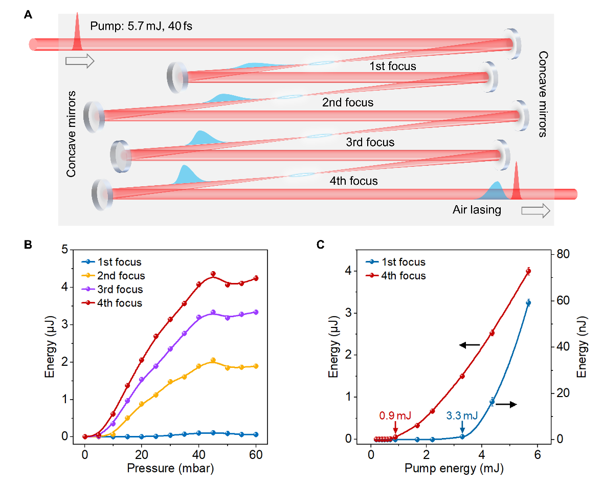 (A)空气激光的级联放大方案示意图;(B)不同聚焦次数下获得的空气激光能量随气压的变化;(C)单次和四次聚焦情况下,在40 mbar氮气中获得的空气激光能量随泵浦能量的变化