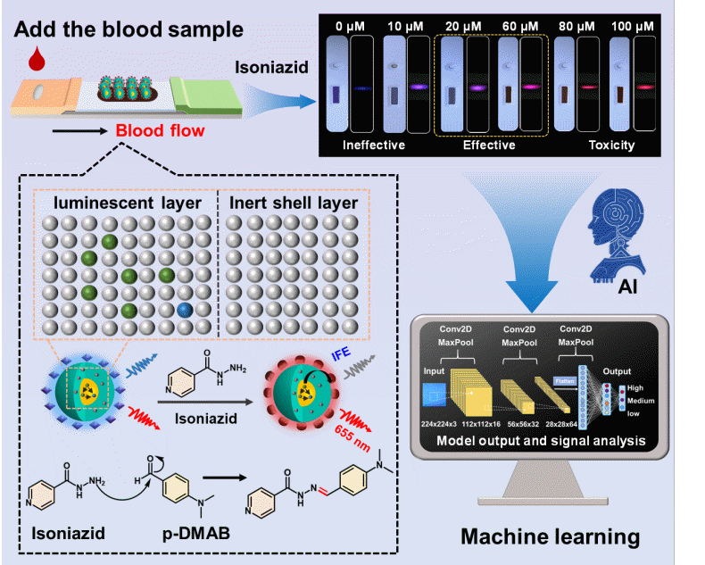 进一步,为解决传统检测方法在复杂血液基质中信号干扰强、操作繁琐、无法实时监测的技术难题,团队设计构筑了NaYF4:Yb,Tm@NaYF4核壳结构纳米颗粒,抑制了表面淬灭效应,提高了上转换发光效率和光稳定性。通过将对二甲氨基苯甲醛和纳米颗粒结合,团队构建出高特异性比率型荧光探针。该探针在无需样本预处理情况下,实现了对抗结核药物异烟肼的快速、高信噪比视觉化检测。同时,团队基于上转换纳米粒子的结构精准调控,开发出可用于全血中药浓度实时监测的智能传感平台。该平台结合3D打印封装、智能手机成像与卷积神经网络分析,实现了荧光信号与药物浓度的自动精准映射,为药物积累引起的肝毒性和神经病变个体化监测及临床诊断提供了技术支撑。