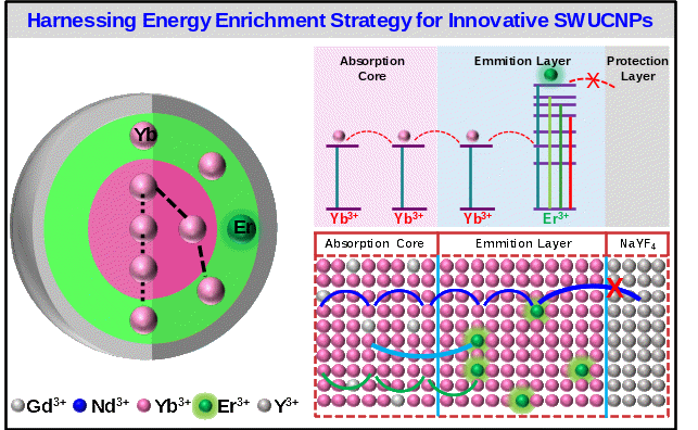 荧光传感技术在食品质量控制及疾病辅助诊断等领域具有应用前景。但是,传统的上转换纳米粒子(UCNPs)中发光离子均匀掺杂的设计,导致核心区离子无法有效淬灭,产生背景信号干扰。早期三明治结构通过限制发光层提高了发光共振能量转移效率,却牺牲了发光中心数量,进而限制传感灵敏度提升。