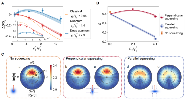 实验研究揭示了若干非经典效应:在深量子区域中,适度的线性耗散反而能够增强同步特性,这与经典行为存在本质区别;通过施加特定方向的非经典压缩操作,可抑制量子噪声,提高同步的稳定性;在强压缩条件下,系统会出现相空间分布的分岔现象,形成双稳态特征,展现出丰富的非线性量子动力学行为。
