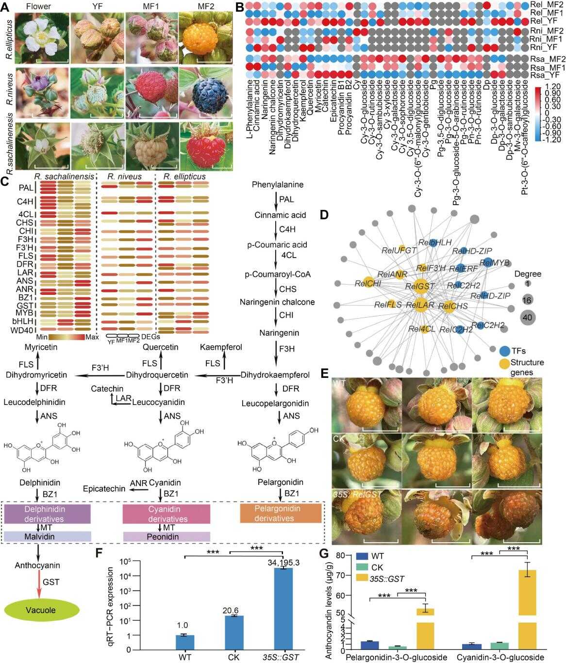 通过整合红、黄、黑三种果实颜色的不同悬钩子物种主要发育阶段的代谢与表达谱数据,研究团队揭示了果实品质性状形成的遗传机制。代谢分析显示,在果实成熟过程中药用成分(黄酮、酚酸、萜类)逐渐减少,而营养成分持续积累,提示“未成熟果侧重防御、成熟果吸引传播者”的生态策略,为优化药用与食用采收期提供了理论依据。整合转录组分析发现,椭圆悬钩子的黄色果实虽然能够正常合成花青素(如飞燕草素、矢车菊素),但因谷胱甘肽转移酶基因(RelGST)表达受抑,导致花青素无法有效转运至液泡积累,而叶黄素等类胡萝卜素的积累使得果实呈现黄色。通过瞬时过表达RelGST可使黄果显著变红,且花青素类化合物的含量提升近200倍,证实了其为果实颜色限制因子,为树莓果实颜色育种提供了候选靶基因。