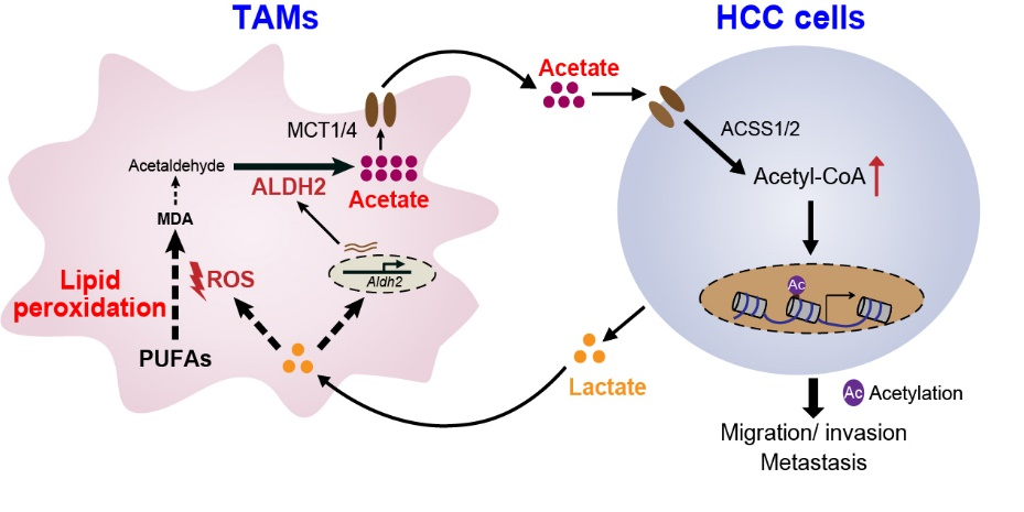上述研究揭示了肝癌细胞与TAMs之间新的代谢互作模式,为解析局部代谢微环境调控癌细胞表型转化的机理提供了新思路。同时,研究发现脂质过氧化途径可作为TAMs乙酸的主要来源,为靶向TAMs的脂质过氧化-ALDH2通路干预肝癌转移提供了理论依据。