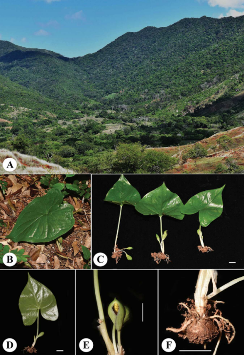 2025年1月,中国科学院武汉植物园,与津巴扎扎动植物园、塔那那利佛大学组成联合科考队。在马达加斯加北部达莱纳地区进行野外本底调查期间,科考队关注到一个林下地生的灰岩芋属居群,该属植物通常被认为是典型的石生类型。经野外初步观察,该灰岩芋属植物叶为宽心形-箭形,与2012年在该地区发表的Carlephyton darainense相似,但其黄色的肉穗花序以及单雄蕊的雄花序,引起了研究人员的注意。