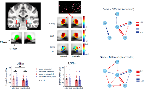 全局特征注意在丘脑外膝体LGN的层特异性调控作用和功能连接