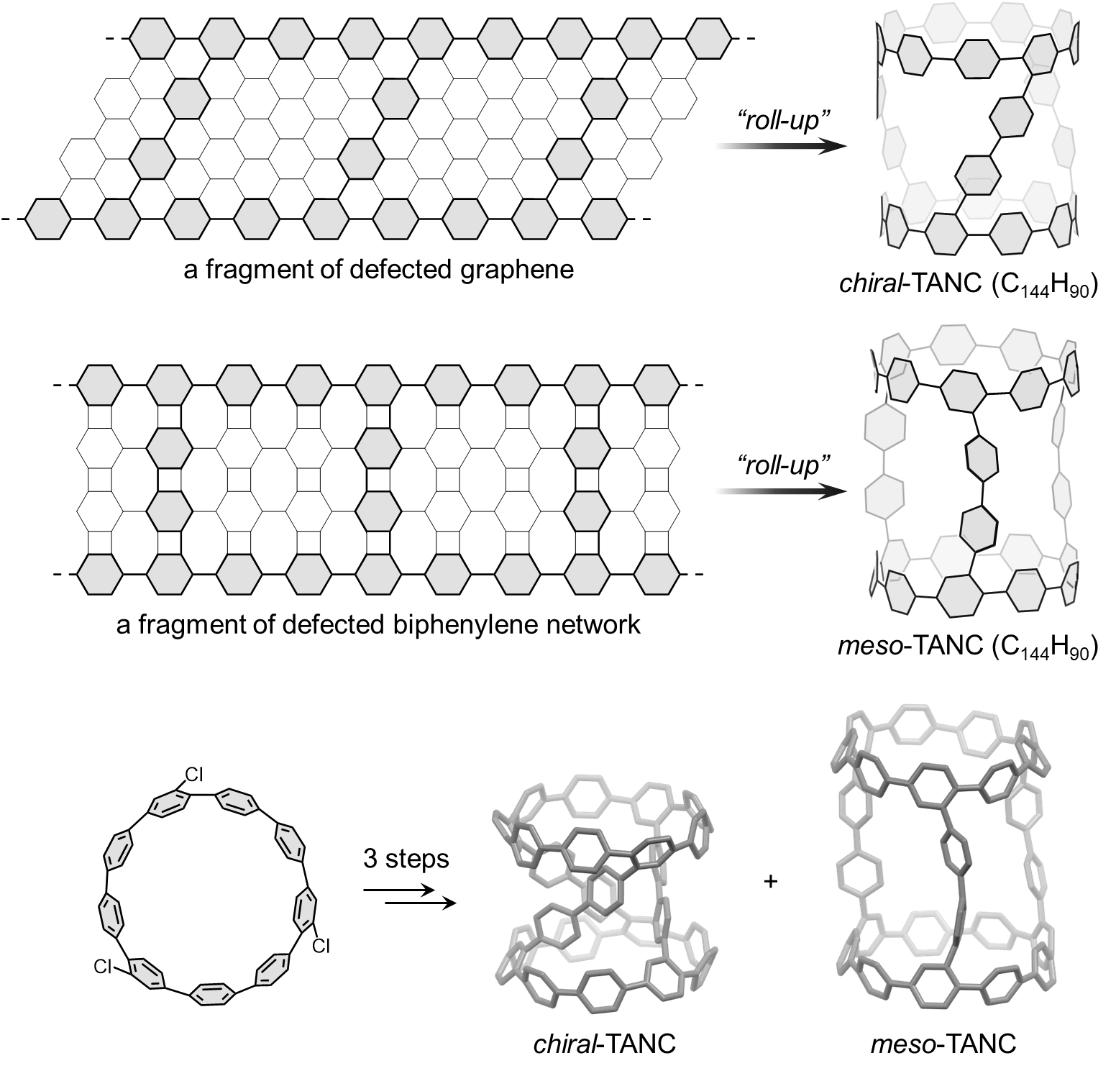 科研人员从定点官能化的环对苯撑出发,通过轴向官能团转化和苯-苯键的共价连接,分别合成了手性-TANC和内消旋-TANC两种异构体。手性-TANC,可视为缺陷石墨烯片段的卷曲对应体,在光激发下可通过桥联苯单元的折叠/解旋,实现构象动态运动,从而产生螺旋手性的动态演化。内消旋-TANC,在结构上对应缺陷联苯网络的卷曲片段,其晶体结构显示桥联苯单元,存在显著的扭曲应变,增强了分子整体构象的刚性。
