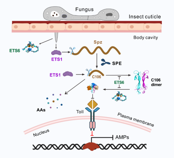 团队进一步通过酵母细胞的正反向双杂、蛋白水平的互作验证,证明绿僵菌M28家族的金属蛋白酶ETS1和功能未知的ETS6同Spätzle及C106均存在互作。生化功能等验证表明:氨肽酶ETS1可降解Spätzle和C106;昆虫免疫应答可上调、“补偿”表达Spätzle,但ETS6可阻止C06二聚化,又可挟持、阻止C106二聚体同Toll受体结合,从而抑制抗菌肽表达。不同昆虫的Spätzle/C106氨基酸序列高度分化,但不同昆虫甚至非昆虫无脊椎动物的C-末端成熟配体,可形成结构高度相似的二聚体结构。ETS1和ETS6可作用于不同昆虫的免疫配体,表现出广谱杀虫活性。