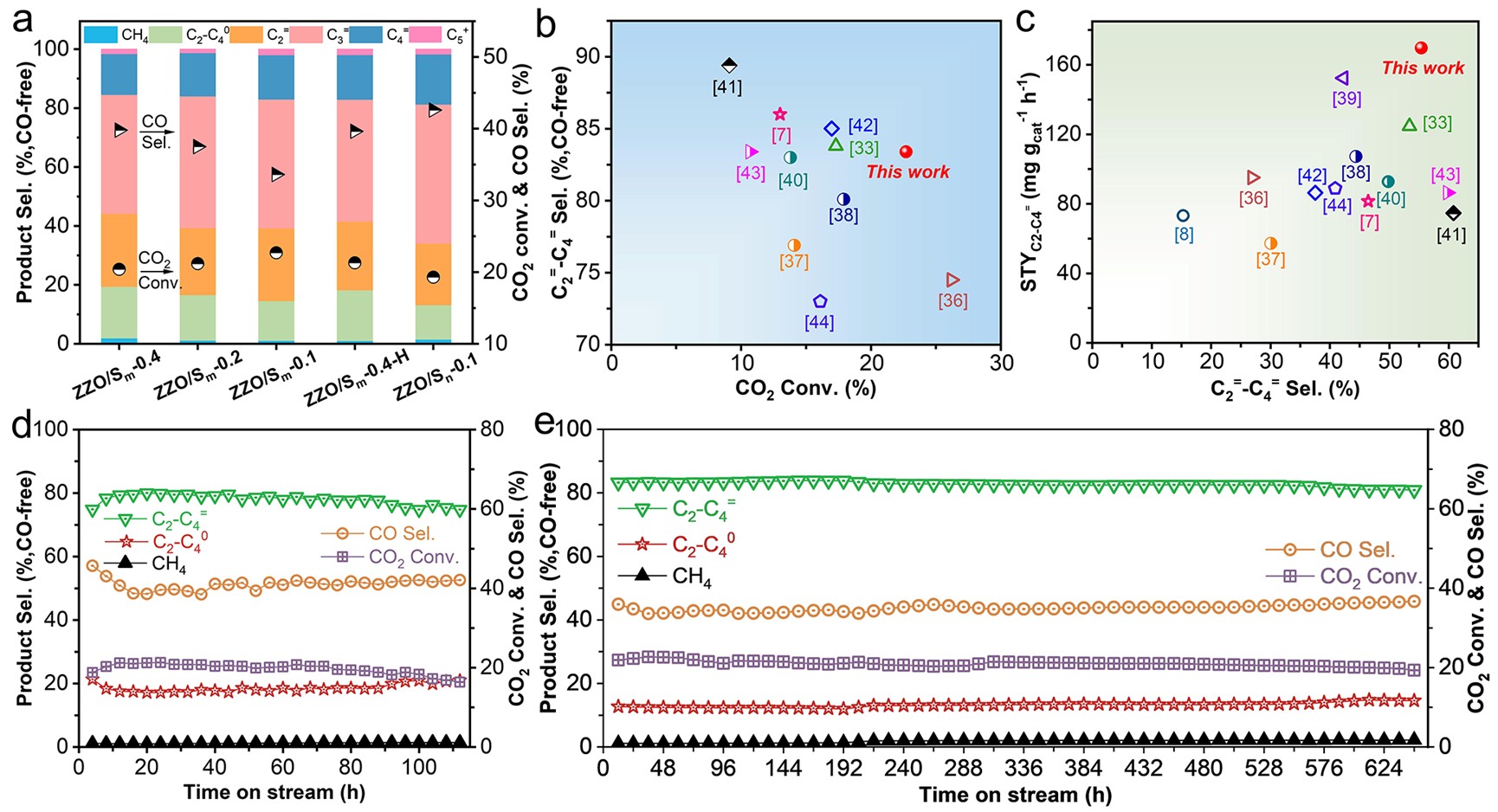 团队借助原位表征技术与理论计算研究手段,揭示了CO2与H2经由甲醇中间体转化为低碳烯烃的反应路径,这一反应机理解释了产物中丙烯选择性较高的现象。同时,等级孔SAPO-34分子筛展现出多功能催化应用潜力,可高效转化合成气、富CO2合成气、CO/CO2/H2宽范围比例的混合气,以及甲醇制备低碳烯烃。这一环境友好的合成策略,可简便、低成本、大规模地制备出具有长周期反应稳定性的等级孔SAPO-34,克服了等级孔SAPO-34在实际应用中面临的关键瓶颈。