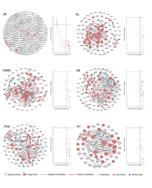 研究揭示,土壤微生物在热带珊瑚岛生态恢复过程中存在“分工协作”规律。在恢复初期,土壤真菌作为“先锋部队”,凭借其耐旱、耐盐特性高效分解难降解有机质,为植物定植创造条件,在稳定微生物网络结构中发挥核心作用。随着恢复进程推进,土壤细菌生物量逐渐增加,成为共现网络中的“模块枢纽”,通过促进碳、氮、磷等元素循环,承担起维持生态系统长期功能与稳定性的“主力军”作用。