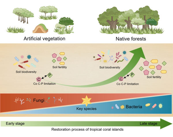 热带珊瑚岛人工植被向原生植被恢复过程中土壤微生物、土壤理化性质、养分限制情况及微生物网络关键物种动态变化概念图。